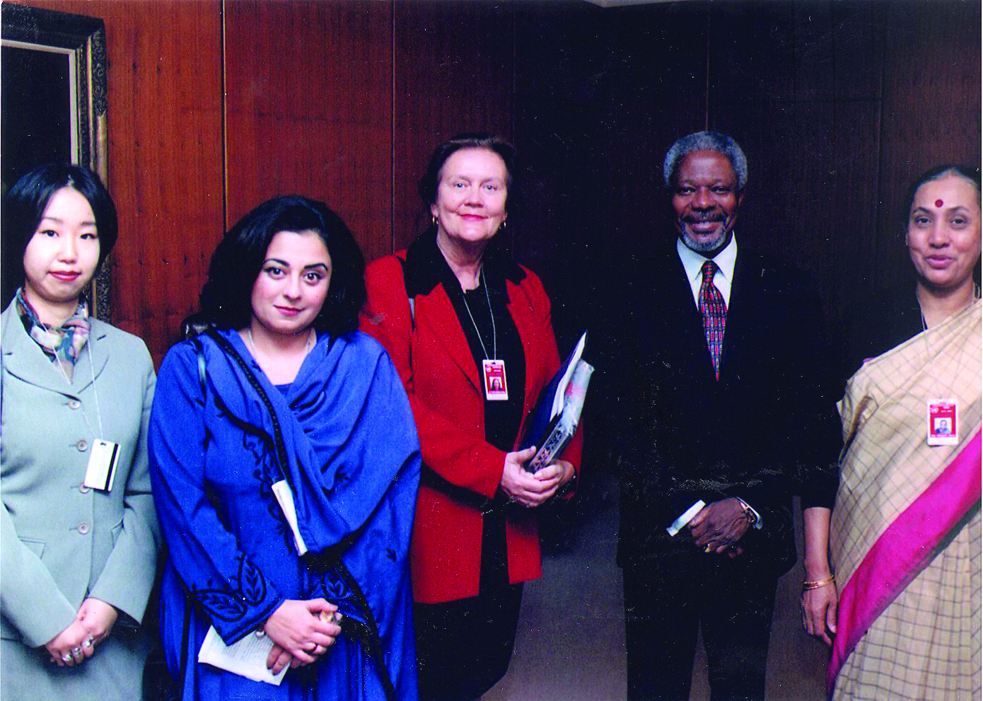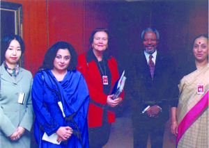 Shazia Rafi with Sen. Margaret Reynolds [Australia] and UN Secretary-General, Kofi Annan after handing the UN a list of senior women for UN recruitment, 1997